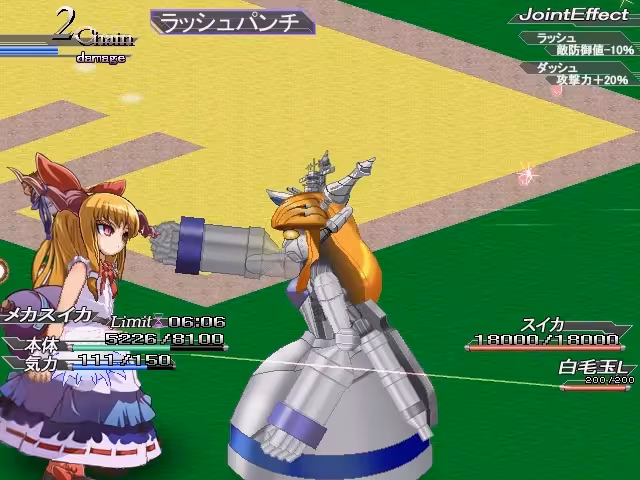 有点像驾驶高达格斗的游戏,每一关目标是在没有小地图的地图中找到boss并打败。自己控制的是メカスイカ,基本上去碰敌人就能碰死一群,不过每个新关都给你出几个恶心的小怪,不好打而且伤害高那种,可以学几个技能再进去用技能打。每关需要在限定时间内找到并打败boss,注意不要按到自爆键,会直接失败,被打死或者超时也是失败。胜利之后会结算本关,奖一些钱并且升职级,关卡结束可以给メカスイカ花钱改造、学技能,而改造项目根据自己(灵梦)职级开放。